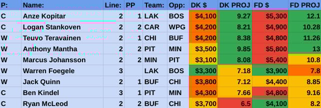 Some people call these "value" plays or "salary savers", but these are players that I like for tonight that fit at the lowest salary tier. It could be they're playing on one of the top forward lines, or it could be that they've been playing well, but these are my cheap calls for a skater to pick up a goal or assist.