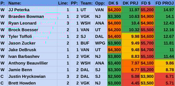 If you take anything away from this, remember that hockey is a high-variance sport. The top-ranked player in each category could be a great play or be a dud tonight. Going all-in on any player probably isn't a great move.