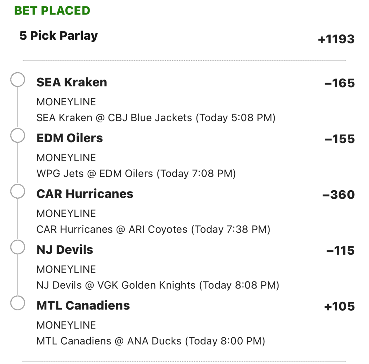 My picks for moneyline bets. Run singles or tail the full parlay: