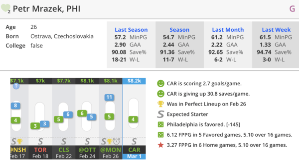 Petr Mrazek - PHI - $8200 DK/$7900 FD